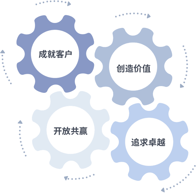 成就客户是一切决策的出发点,,,,创造价值是衡量所有工作的标准,,追求卓越是我们做事做人的态度,,,开放共赢是我们的格局也是最终的结果。。。价值观的齿轮环环相扣,,推动着组织里的每个人不断向前。。。